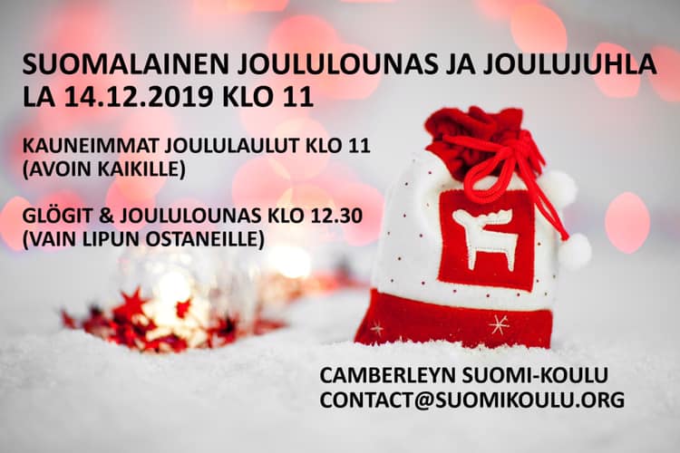 Lauantaina 11. joulukuuta 2021 jรคrjestรคmme koulun perinteisen joululounaan ja โjuhlan. Pรคivรค alkaa kauneimmilla joululauluilla klo 11.00, joita tulee vetรคmรครคn Lontoon merimieskirkon edustaja. Heidรคn mukanaan tulee toivottavasti myรถs kauppa, josta pรครคsemme ostamaan jouluherkkuja. Kauneimpiin joululauluihin ovat kaikki tervetulleita.